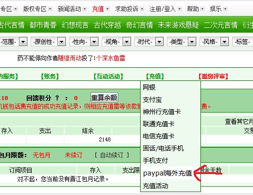 晋江文学城にPayPalでチャージする方法 他にも説明されてる方がいますが自分でもやってみたので記録用に。 事前にPayPalアカウント作成&PayPalアカウントにクレジットカード登録まで済ませた状態でやりました。 晋江のアカウント作成方法は記事の最後に参考にさせてもらったページのリンクを貼ってます。 1、ブラウザから晋江文学城にログイン 2、「財務」から「我的余額」に進む (「財務」の「消費記録」からでもOKです) 3、「充値」のプルダウンから「paypal海外充値」を選択 4、初回は秘密の質問を設定するように言われるので(設置密保)、ログイン用パスワード(一番上の入力欄)と三つの秘密の質問を選択して回答を入力(あとで再度入力を求められる) 5、(初回は秘密の質問設定後にまた3に戻る)PayPal支払画面になるのでチャージ金額を選択し(17USドルか34USドル)、金額選択のすぐ下の黄色いボタンを押して同意 6、PayPalのサイトに遷移するのでPayPalにログインして支払いをする 7、成功するとPayPalの履歴に晋江文学城への入金記録が残る これまではiPhoneのアプリからApple IDでチャージをしてたんですが、PayPalは17USドルで10000ポイント、Apple IDは3800円で12480ポイントと、たぶんこっちの方がお得です。(ただしApple IDの方が楽) 参考にさせてもらったページなど ・Androidでの晋江文学城のポイント購入(チャージ)方法(https://privatter.net/p/6808409) (他の投稿で晋江アカウントの作り方やタオバオ(淘宝)からのチャージ方法も紹介されてます) ・「晋江文学城」の登録方法について (http://scentofink.soragoto.net/touroku.html) ・「晋江文学城」のチャージ方法について (http://scentofink.soragoto.net/charge.html) ・晋江文学城登録方法の解説ツイート [8回]